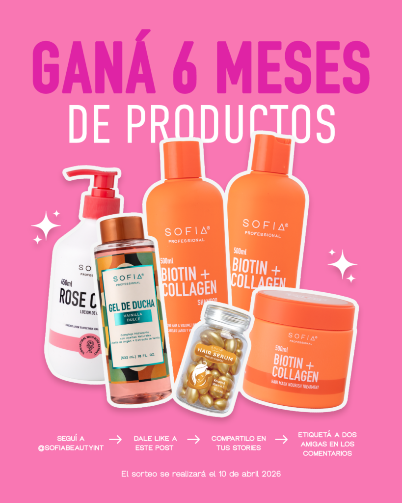 El ganador recibirá 6 meses de productos Sofía. El premio será entregado de manera mensual en las oficinas de Sofía el que consiste en: 1 Shampoo Sofia Keratina, 1 Acondicionador Sofia Keratina, 1 Mascarilla Sofia Keratina, 1 Gotas Hairshine Sofia 65ml, 1 Gel de ducha, 1 crema corporal, 1 bloqueador facial  Sofía Faces. El premio no es transferible ni canjeable por dinero.